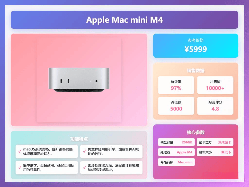 Mac mini的特点在于速度快、体验流畅。它的设计简单易上手,macOS系统配合硬件,使用起来非常舒适。值得一提的是,这款Mac首次实现了碳中和设计,耐用性也很高,结构坚固,使用起来更放心。